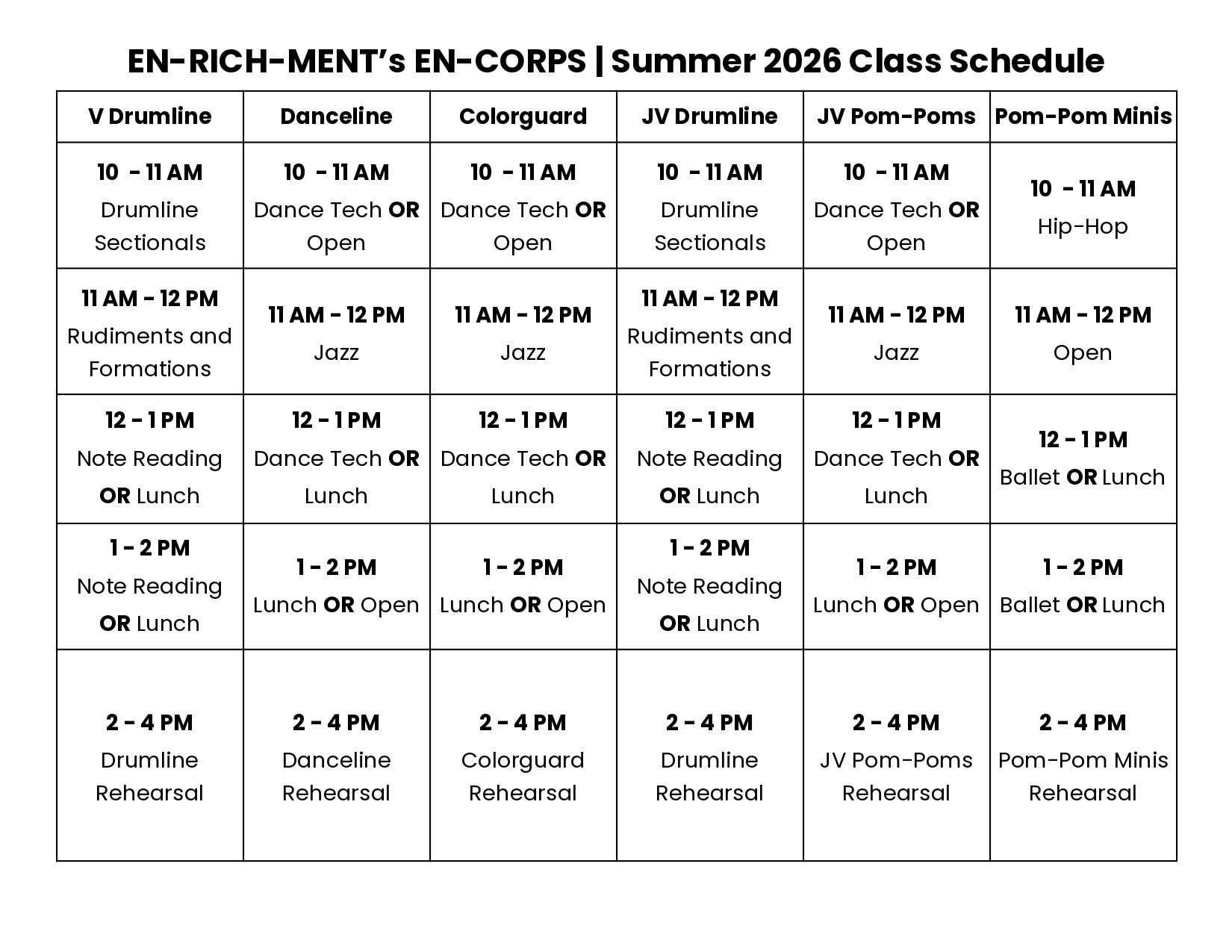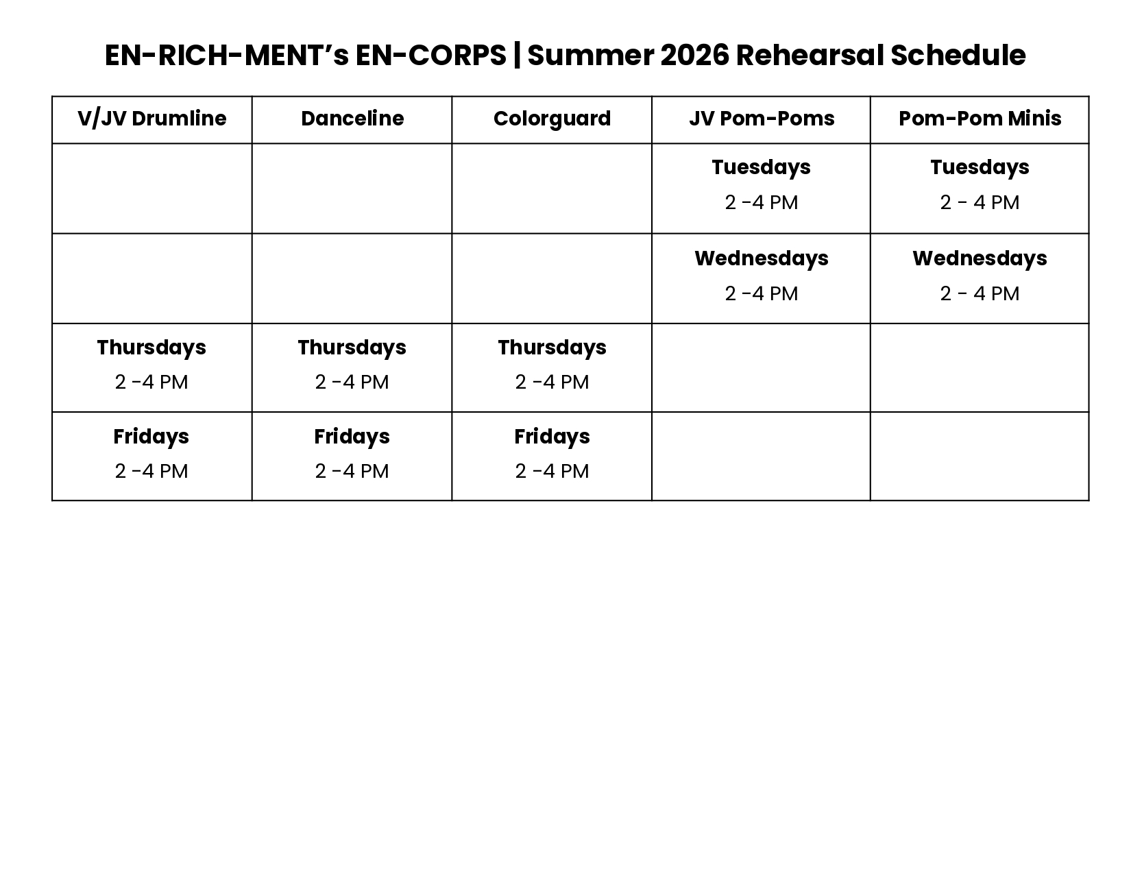 Danceline, Colorguard and Pom-Poms are EN-RICH-MENT's performing dance groups. JV Pom-Poms are chosen from Pom-Pom Minis when deemed ready, and Pom-Pom Minis are open for all students to enroll. Danceline and Colorguard (Audition) requires 2+ years experience, and students must audition.