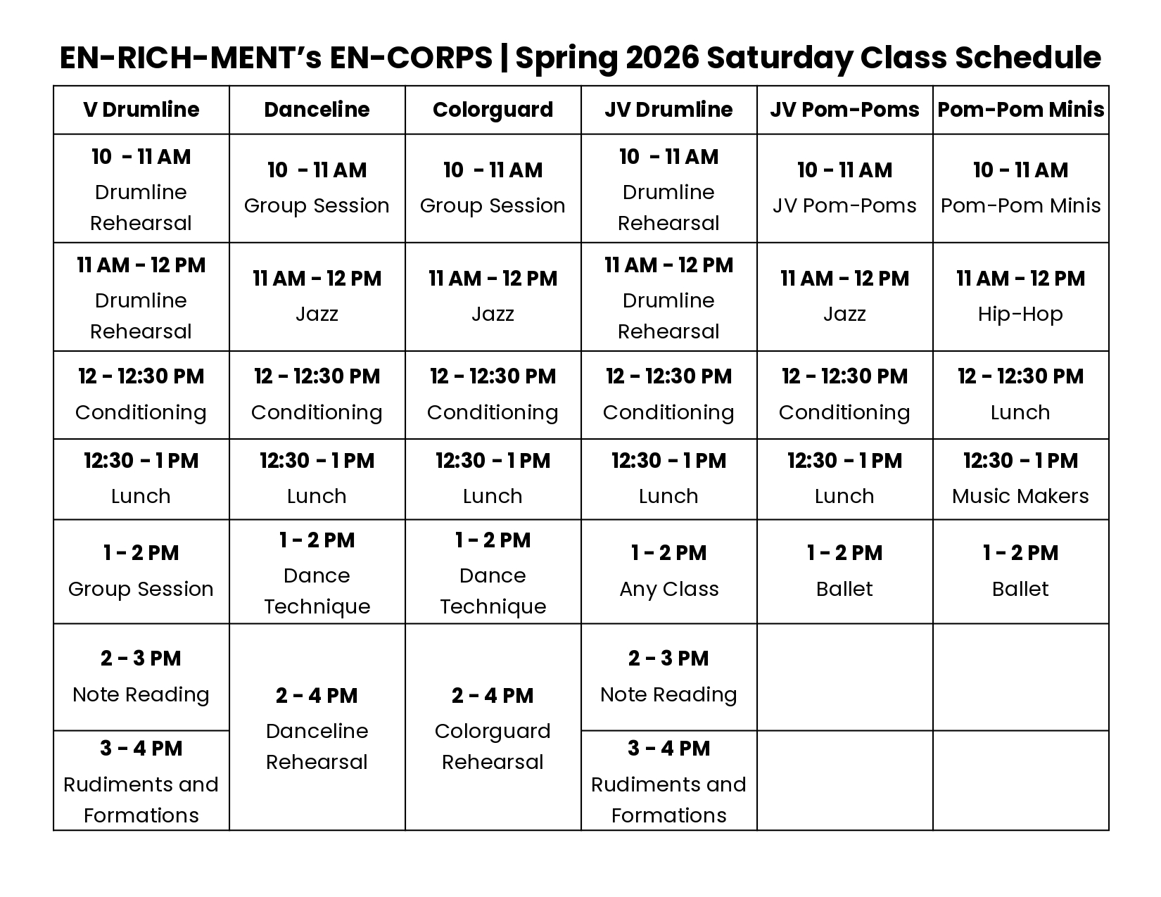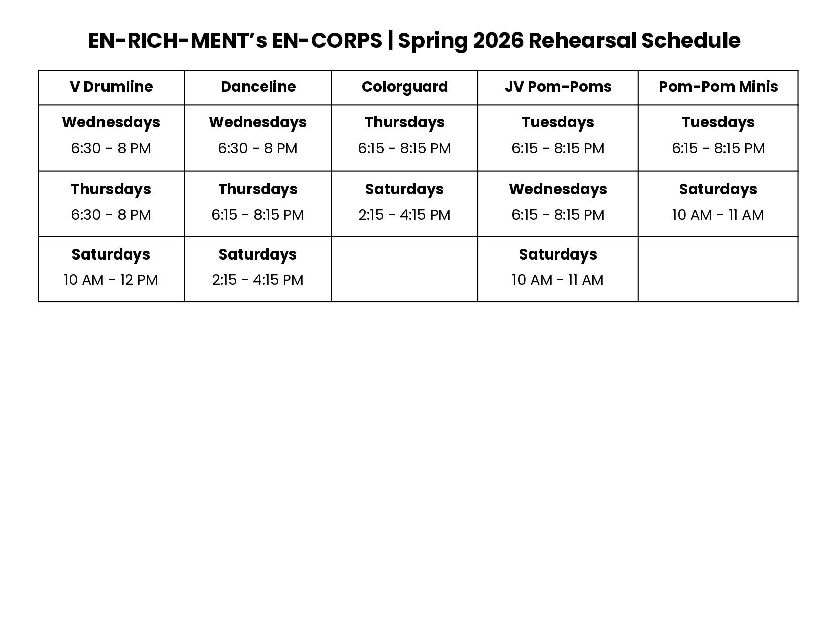 Danceline, Colorguard and Pom-Poms are EN-RICH-MENT's performing dance groups. JV Pom-Poms are chosen from Pom-Pom Minis when deemed ready, and Pom-Pom Minis are open for all students to enroll. Danceline and Colorguard (Audition) requires 2+ years experience, and students must audition.
